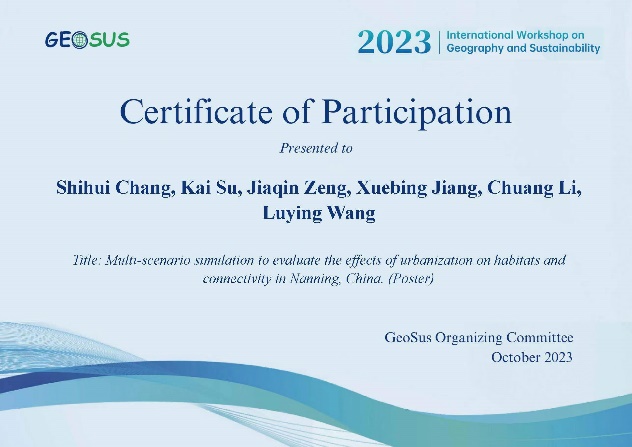 近日,公司研究生常士慧收到地理学与可持续性国际学术会议(International Workshop on Geography and Sustainability,简称GEOSUS)邮寄来的获奖证书。