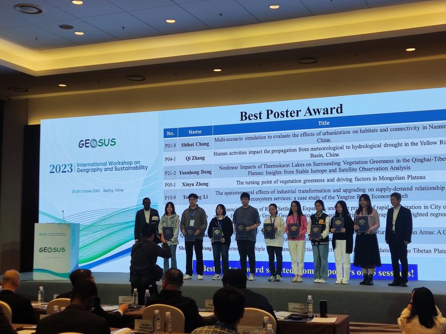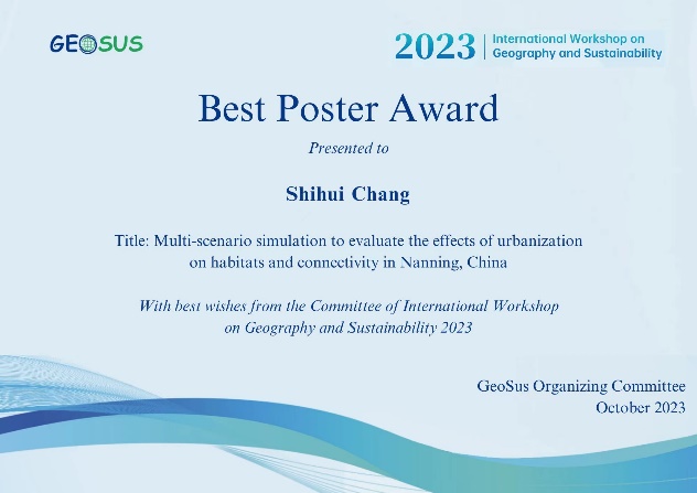 公司研究生常士慧受邀参加2023 GEOSUS,以“Multi-scenario simulation to evaluate the effects of urbanization on habitats and connectivity in Nanning, China”为题进行墙报演讲,与参会人员开展了深入交流与讨论。研有所获,公司研究生常士慧在墙报评比中获得“Best Poster Award”(最佳墙报奖)并登上颁奖台与颁奖嘉宾合影留念。