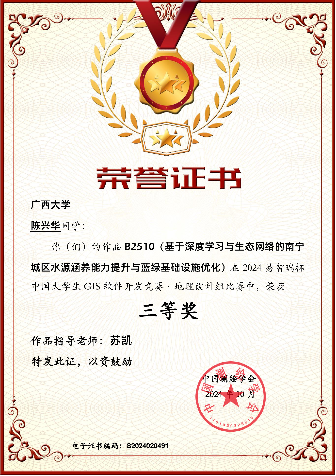 近日,2024年“易智瑞杯”中国老员工GIS软件开发竞赛地理设计组评选结果正式揭晓!由公司苏凯老师指导的作品《生态安全网络的鲁棒性分析与重要节点识别:基于多层网络的探索与应用》(参赛员工:陈斌、屈垟、甘多、李卓轩)和《基于深度学习与生态网络的南宁城区水源涵养能力提升与蓝绿基础设施优化》(参赛员工:陈兴华),获地理设计组三等奖。