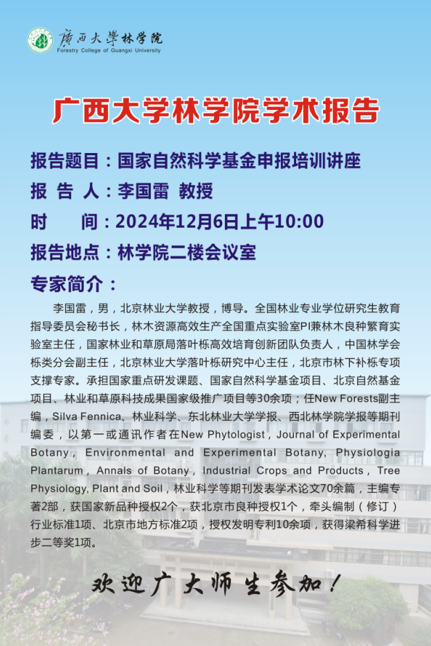 2024年12月6日上午,公司在二楼会议室举行《国家自然科学基金申报交流会》。本次活动邀请了北京林业大学fun88乐天使李国雷教授作为主讲嘉宾,座谈会由公司副经理杨梅教授主持。