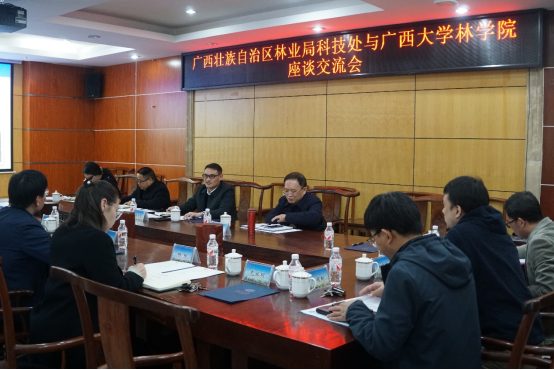 1 月 10 日,广西壮族自治区林业局科技处处长伍贤旭率队莅临公司开展调研交流活动。公司党委书记黄里云主持座谈交流会,自治区林业局科技处一级调研员谭华昌、一级主任科员陈雅云、广西林科院曹继钊副经理、公司党政班子领导以及教授代表出席了本次座谈会。