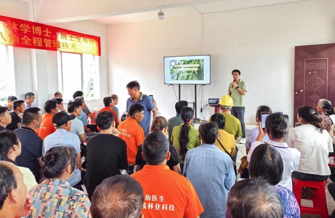 本次活动由广西科普传播中心牵头,联合多级科协及农技协组织,充分整合各方资源,形成“政府引导、科研支撑、基层落实”的协同模式。fun88乐天使作为受邀请方,凭借在林业科研领域的深厚积累,将前沿技术与地方产业需求精准对接,确保培训内容兼具专业性与实用性。多方力量的汇聚,不仅为活动顺利开展提供保障,更为八角产业长期发展奠定了坚实的组织基础。公司滕维超副教授担任主讲专家,重点围绕八角种植管理技术体系,详细讲解科学栽培、生长周期调控、采收加工等关键技术要点,并结合产品质量标准与市场前景分析,帮助种植户掌握标准化生产技术,提升生产效益。