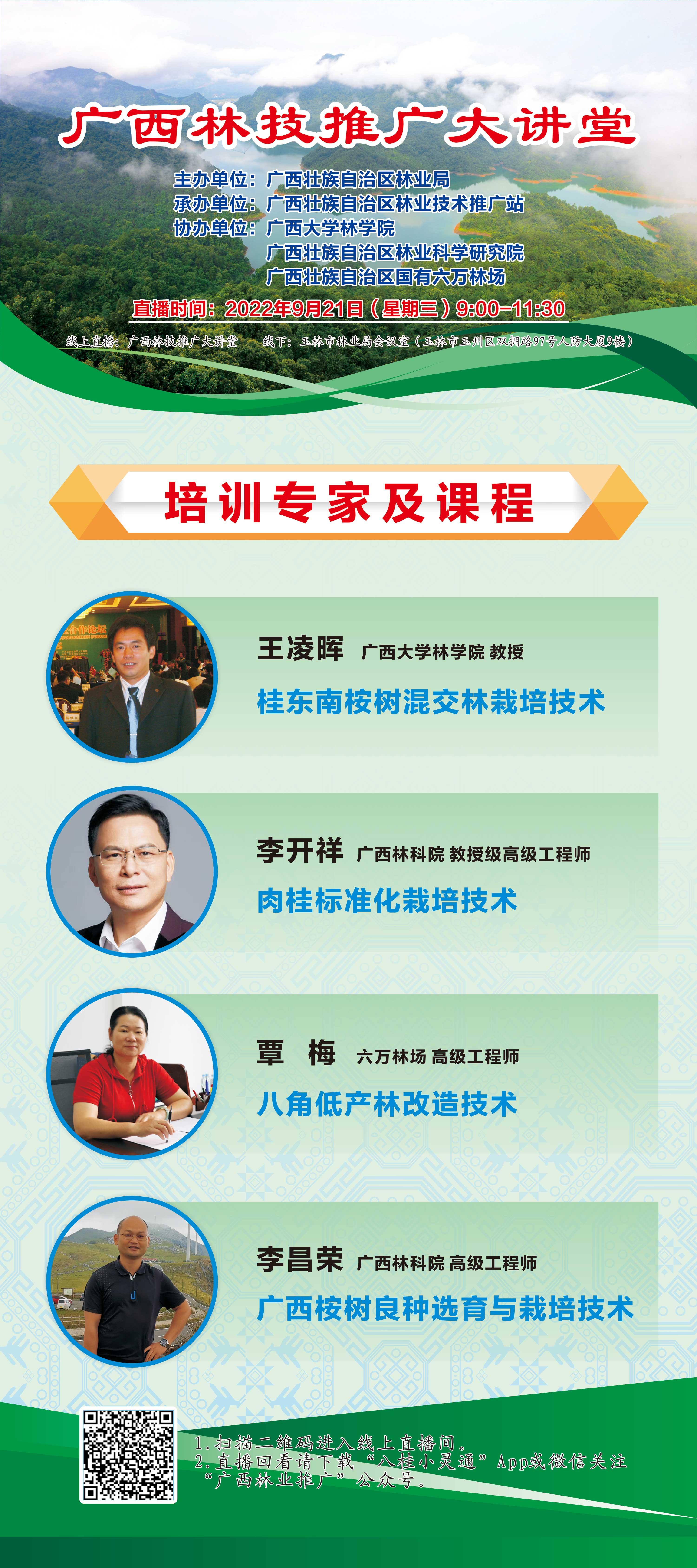 由广西壮族自治区林业局主办,公司作为协办单位之一的广西林技推广大讲堂第2期于9月21日(星期三)上午9时通过线上和线下两种方式开讲,线上直播可通过微信扫码方式进入,欢迎公司师生进入课堂听课。