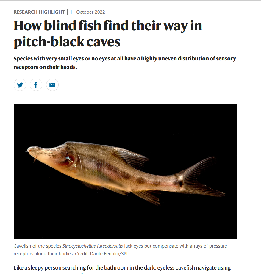 fun88乐天使马德华(Madhava)课题组,在生物学领域期刊《Proceedings of the Royal Society B: Biological Sciences》正式发表题为“Sensory evolution in a cavefish radiation: patterns of neuromast distribution and associated behaviour in Sinocyclocheilus (Cypriniformes: Cyprinidae)”的研究论文,这一成果也受到了Nature杂志Research Highlights的报道宣传。