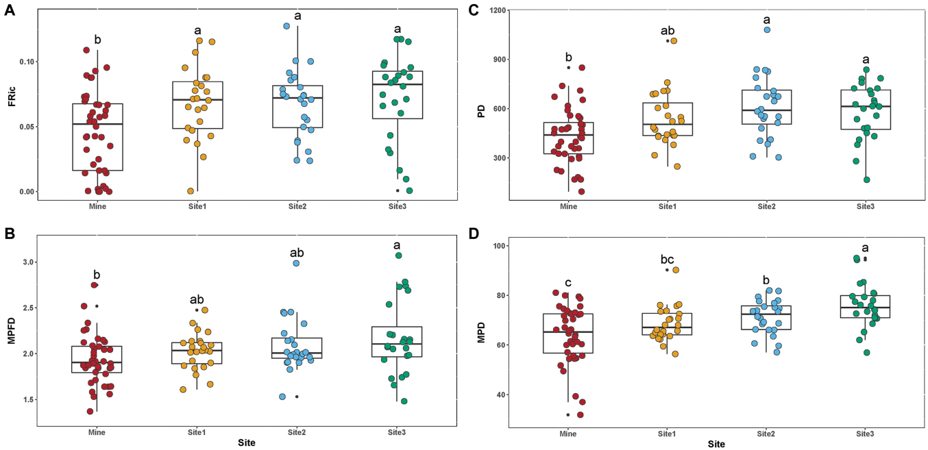 7矿区和非矿区功能和系统发育多样性差异分析