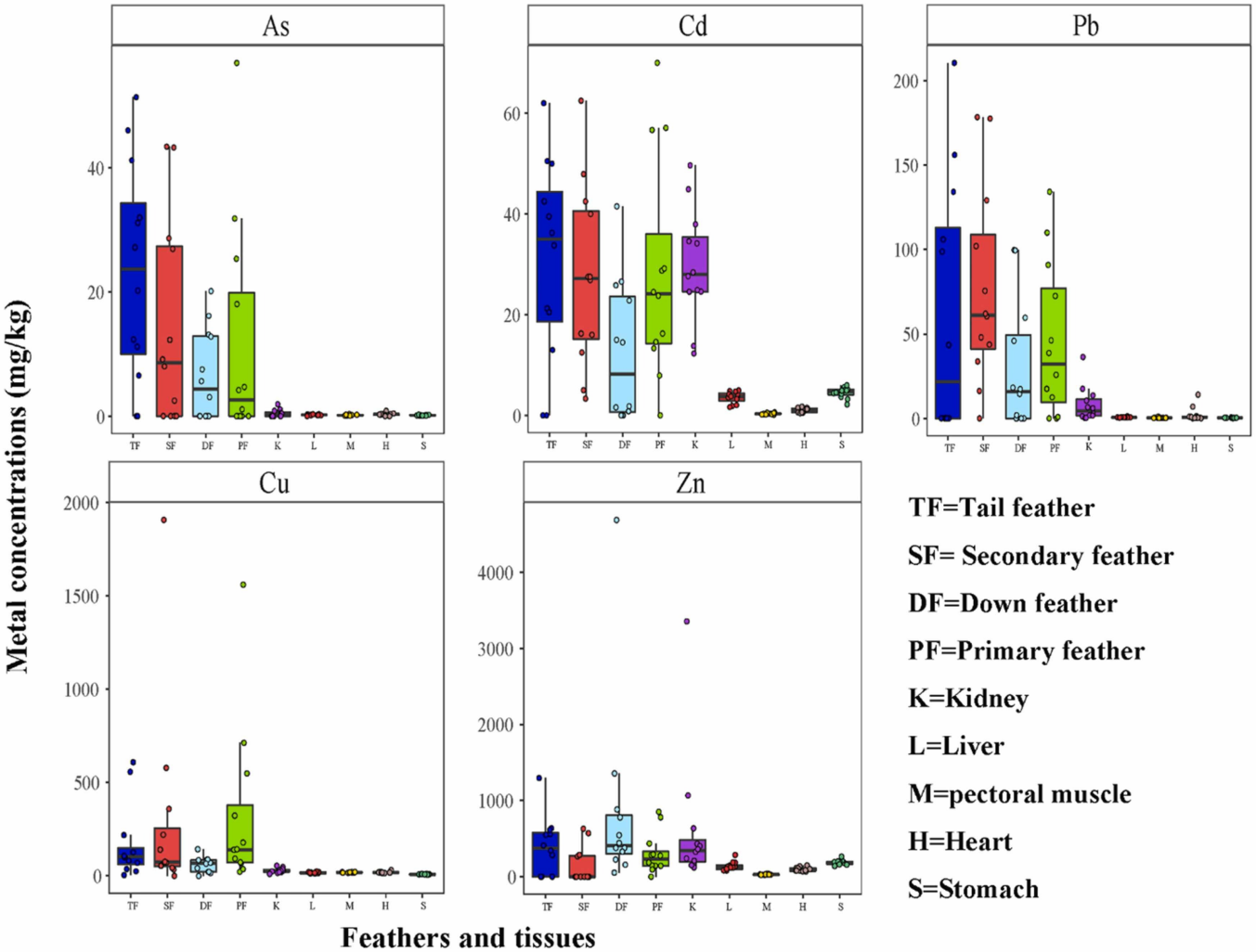 3灰眶雀鹛样品中砷、镉、铅、铜和锌的浓度比较