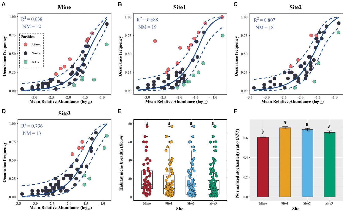 研究结果显示:矿区鸟类的物种丰富度显著低于非矿区2(t=3.99, P<0.001)和非矿区3(t=2.67, P=0.04),与非矿区1没有显著差异性。同样地,矿区Shannon多样性指数显著低于非矿区2(t=4.08, P<0.001)和非矿区3(t=2.92, P=0.02),与非矿区1无差异性。物种丰富度的下降也导致了功能和系统发育多样性的降低。中性群落模型和归一化随机比率结果表明,矿区和非矿区鸟类群落的构建主要由随机过程驱动。
