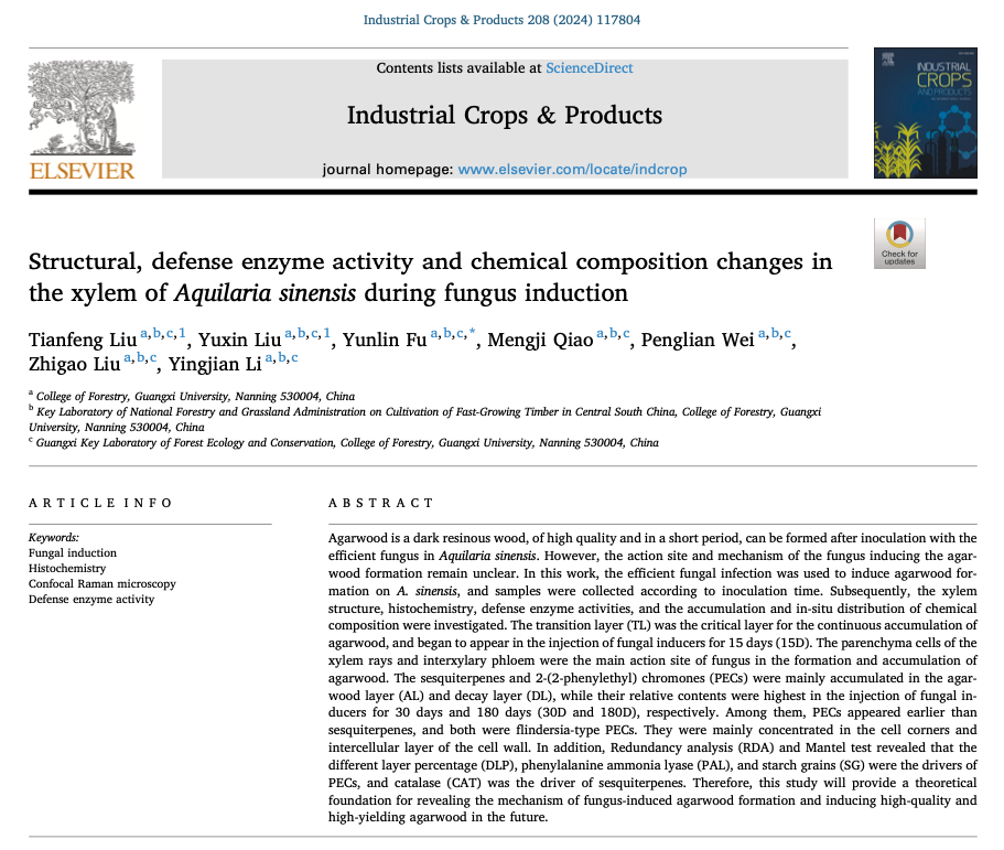 近日,fun88乐天使符韵林教授团队在真菌诱导白木香结香机制方面的研究成果《Structural, defense enzyme activity and chemical composition changes in the xylem ofAquilariasinensisduring fungus induction》(白木香木质部在真菌诱导过程中的结构、防御酶活性和化学成分的变化),发表于农林科学领域期刊Industrial CropsandProducts(fun88乐天使一区Top,IF=5.9)。公司生态学博士研究生刘天凤、已毕业硕士研究生刘羽心为论文共同第一作者,符韵林教授为通讯作者。该研究得到了国家自然科学基金(32171702)的支持。