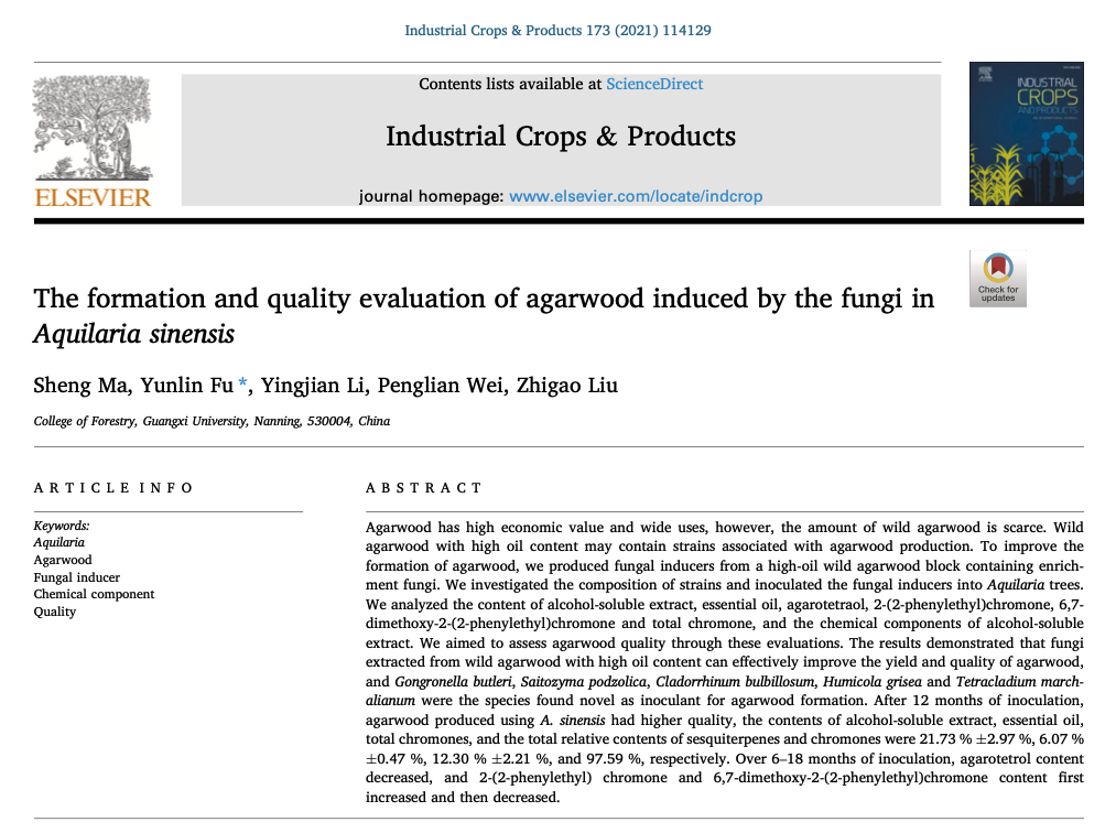 该研究是基于高效结香真菌能诱导白木香形成高品质沉香基础上而进行的深入探索。在此之前,符韵林教授团队新发现了Gongronellabutleri、Saitozymapodzolica、Cladorrhinumbulbillosum、Humicolagrisea和Tetracladiummarchalianum可作为诱导沉香形成的新菌种,它们侵染白木香诱导的沉香质量能与野生沉香相媲美,此项研究成果《The formation and quality evaluation of agarwood induced by the fungi inAquilaria sinensis》(真菌诱导白木香形成沉香及其质量评价)发表于农林科学领域期刊Industrial Crops and Products(fun88乐天使1区Top,IF=5.645)。而本研究揭示了沉香形成的作用部位和驱动因素,这为今后揭示优质高产的沉香形成的分子机制奠定基础。