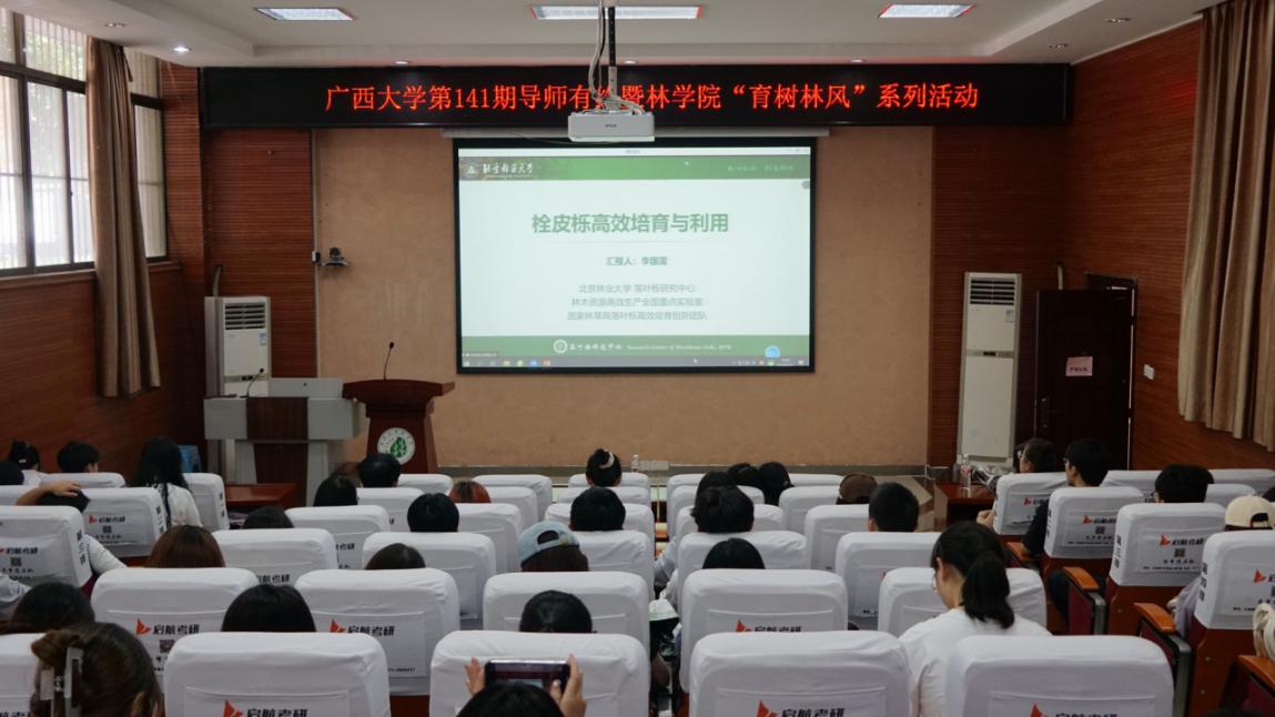 讲座伊始,李国雷教授从栓皮栎的树种资源及世界分布概况作为导入,进而探讨栓皮栎在我国森林资源中的地位和作用,再到产业发展面临的挑战与机遇,他用丰富的数据和实例,为同学们呈现了一个全面而深入的栓皮栎知识科普图谱。