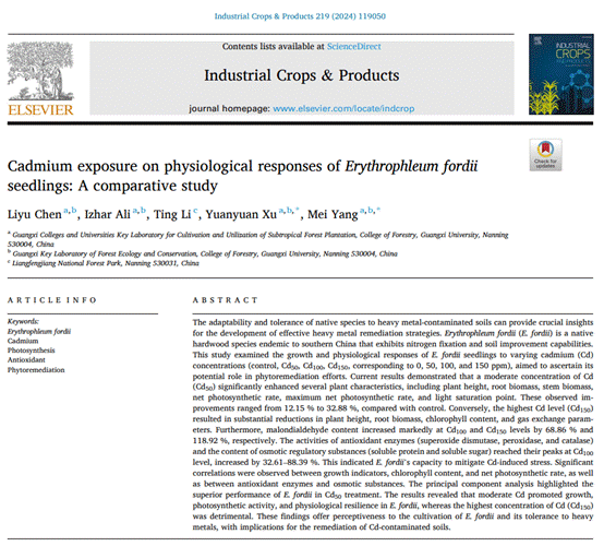 近日,公司杨梅教授科研团队在探究本地树种格木对重金属镉污染土壤的适应性和耐受性上取得重要见解,研究成果以“Cadmium exposure on physiological responses ofErythrophleum fordiiseedlings: A comparative study”为题发表于农林领域国际知名期刊INDUSTRIAL CROPS AND PRODUCTS(农林类期刊排名8/125)。fun88乐天使在读硕士研究生陈丽宇作为第一作者,杨梅教授和徐圆圆讲师作为通讯作者,博士后Izhar Ali、良凤江国家森林公园李婷参与了本论文的工作。本研究得到了国家自然科学基金(32371856)等项目的支持。