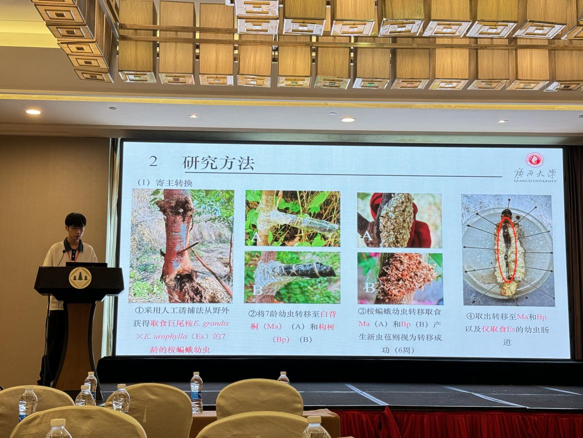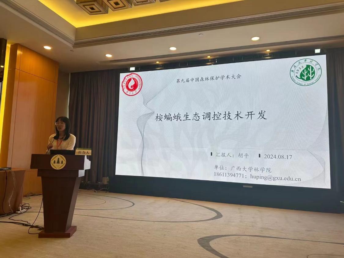 大会以“森林保护科技创新赋能新质生产力发展”为主题,吸引了来自全国各地的700余名高校、科研院所的专家学者参与。fun88乐天使森林保护团队的杨振德教授与胡平副教授带领团队成员参加了此次大会。胡平副教授在大会上作了题为“桉蝙蛾综合防控技术开发”的学术报告,其创新性的研究方法和实践成果,尤其是昆虫灯诱新方法受到了与会专家的高度评价和热烈讨论。此外,博士生周乐明、鲁进韬以及硕士生刘佳欣在森林昆虫分会场的青年学术沙龙中,分别就“桉树枝瘿姬小蜂体内细菌对宿主寿命及酶活性的影响”、“桉蝙蛾肠道微生物多样性与寄主选择的适应性”以及“桉蝙蛾Endoclita vietnamensis味刷的形态学和组织学观察”做了现场分会场的学术报告,都获得了“第九届中国森林保护学术大会做专题学术报告证书”。他们的研究展示了公司森保团队在森林保护领域的最新研究成果,激发了与会者的广泛兴趣和深入讨论。