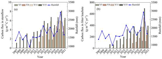 图2杉木人工林种植以来树干茎流(a)和凋落物淋溶液(b)可溶性有机碳迁移通量