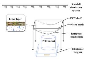 可溶性有机碳(DOC)在降水驱动下经森林树干茎流(Stemflow)和凋落物淋溶(Litter leachate)输入到土壤的迁移机制缺乏系统性模拟研究,尤其在亚热带季风气候影响下,该过程对降水强度的响应规律不明,阻碍对气候变化下人工林碳循环过程的深入认识。该研究以5、8、11、15年林龄的杉木人工林为研究对象,通过人工林原位树干茎流模拟试验和室内模拟凋落物淋溶试验(图1),揭示了不同降雨条件下(30 ~ 110 mm h-1)的DOC迁移浓度和通量变化规律,构建了DOC通过树干茎流和凋落物淋溶的迁移模型,评估了杉木人工林轮伐期内的累积DOC迁移通量。结果表明:1)树干茎流DOC浓度(CSF, mg L⁻¹)和凋落物淋溶液DOC浓度(CL, mg L⁻¹)的迁移模型分别为: