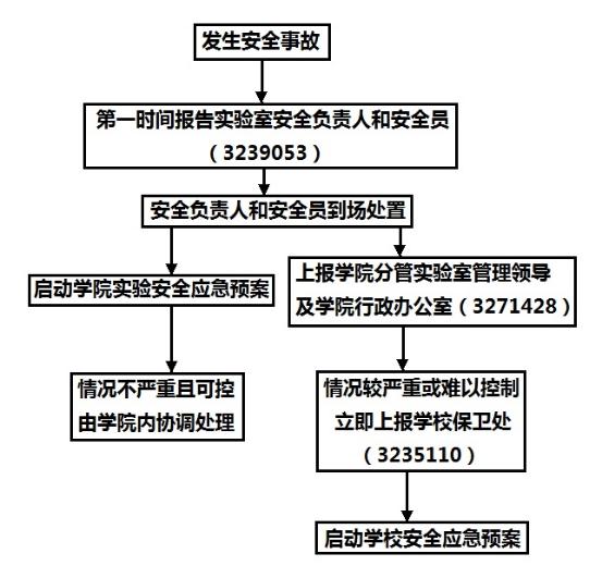 fun88乐天使实验室高温仪器设备多,危险化学品使用频繁,仪器配备少量气瓶,易燃样品堆放集中,安全隐患多且较为分散。实验室安全事故常见有火灾、化学品伤害(中毒或灼伤)、触电等,如发生安全事故,请按以下应急流程进行处理。