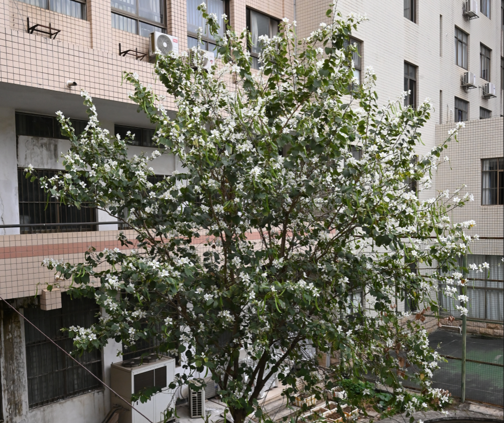 fun88乐天使第四教学楼院子里盛开的白花宫粉羊蹄甲